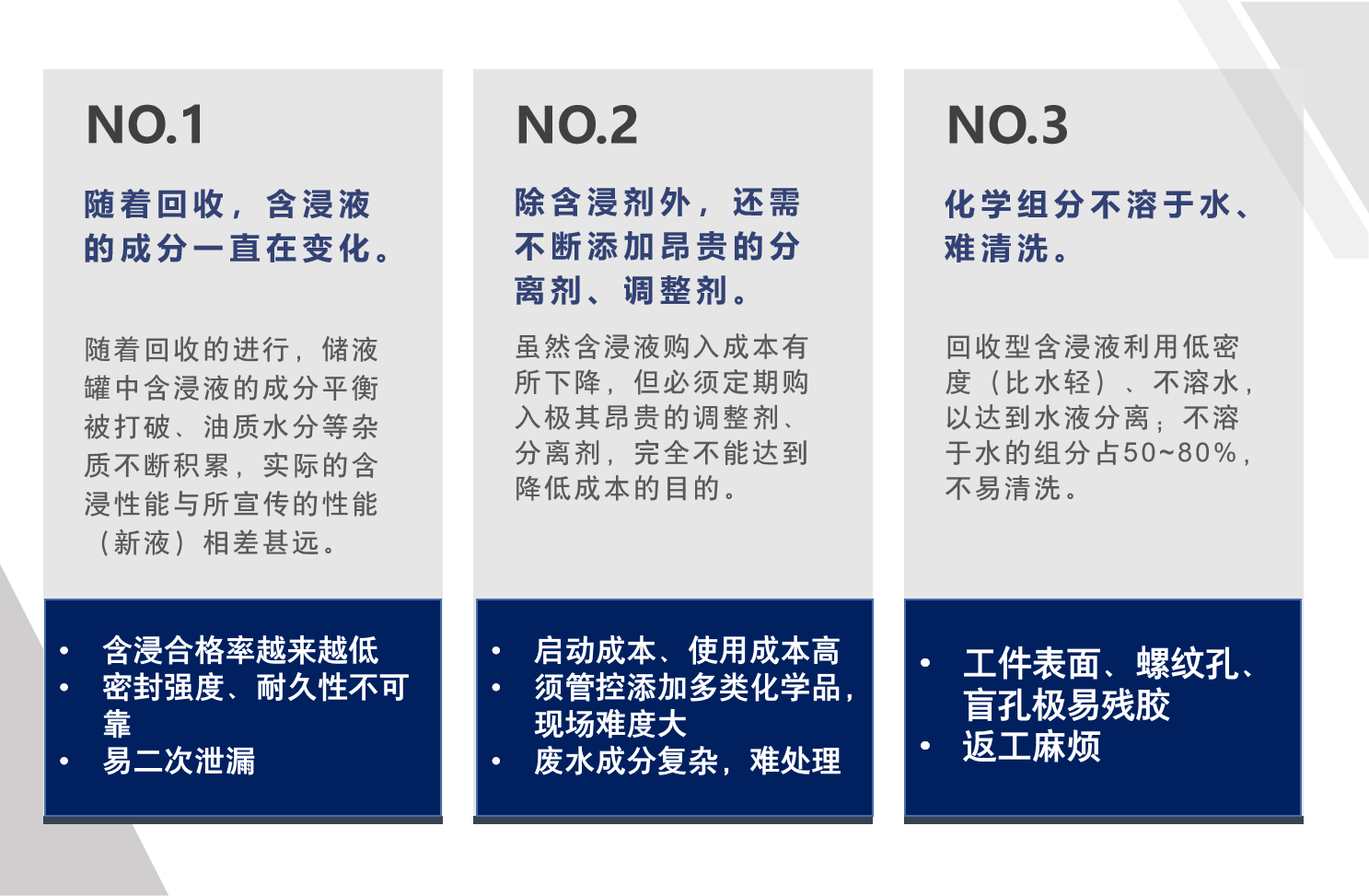 如果貴司正在使用回收型浸滲劑、并受其困擾,請與我們聯(lián)系。我們將免費改造方案,可助貴司實現(xiàn)品質升級。